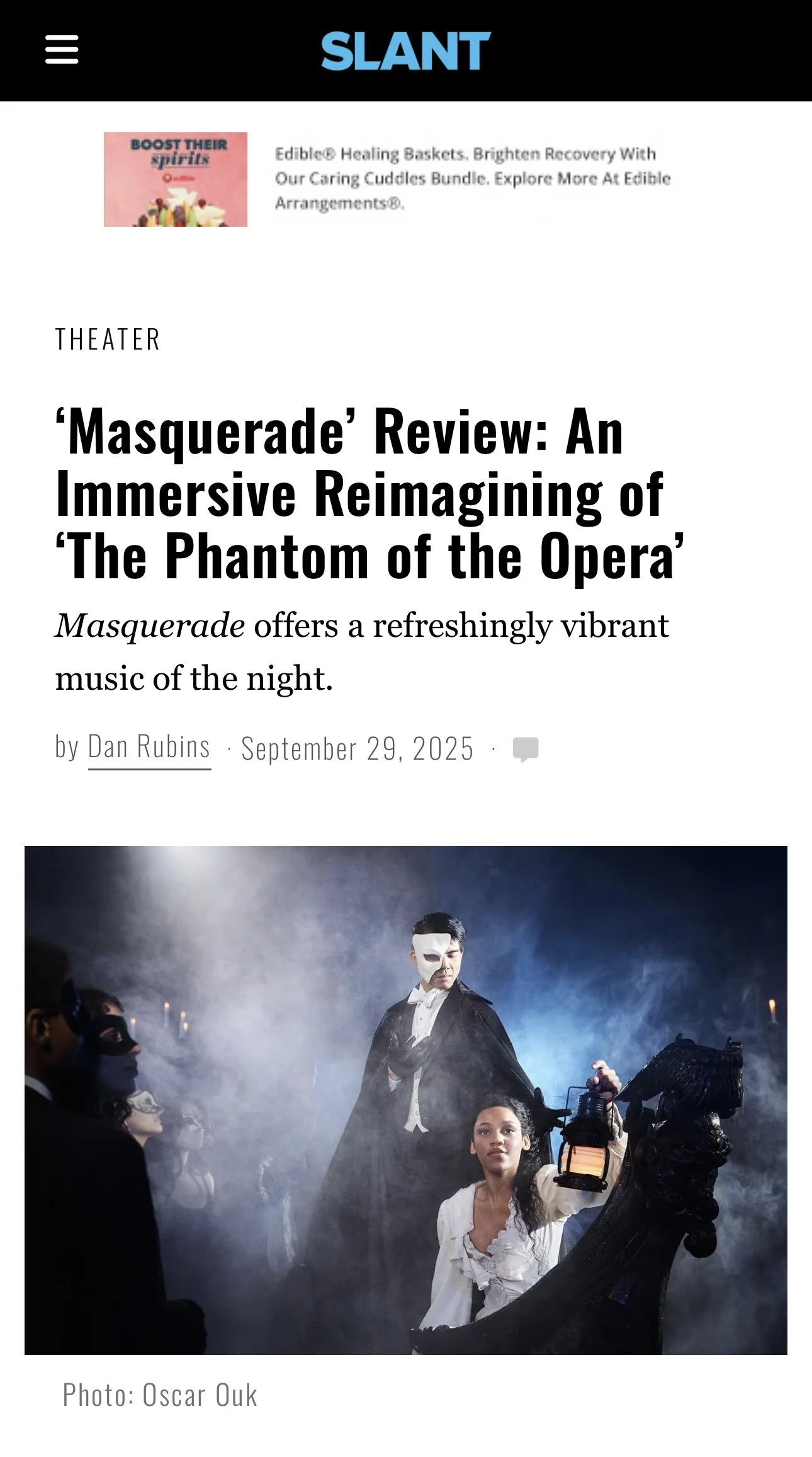 A generous review of Haile’s performance as Christine Daaé in Masquerade featured in Slant Magazine.